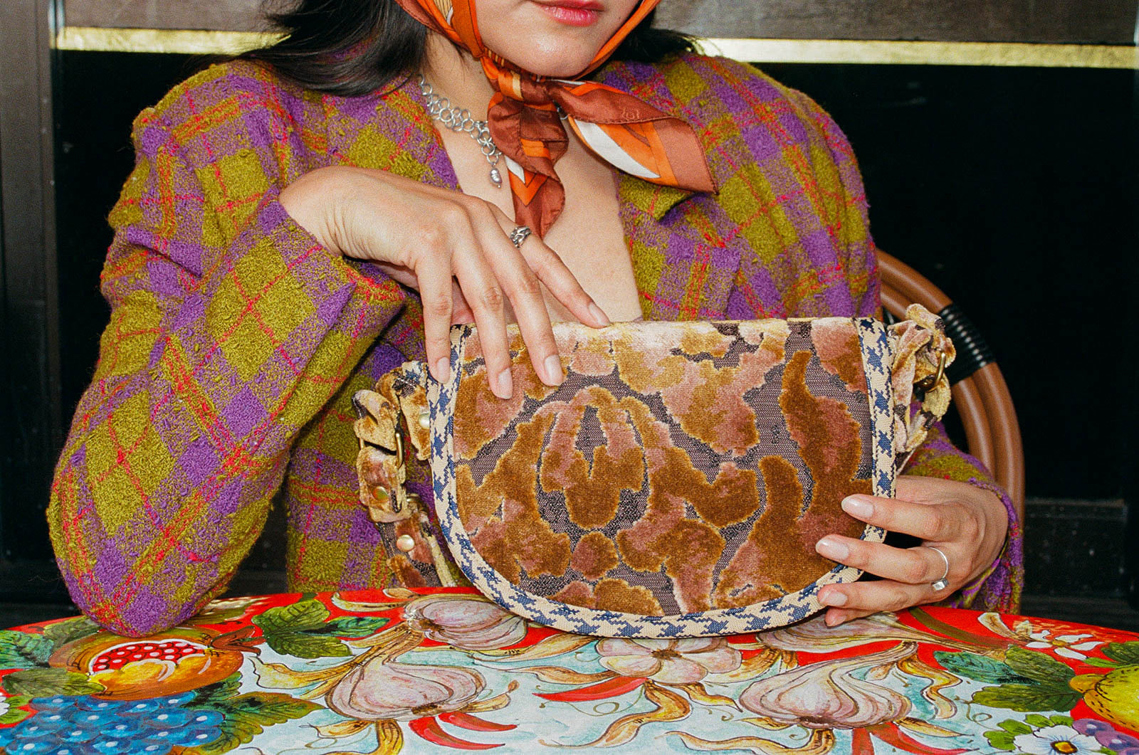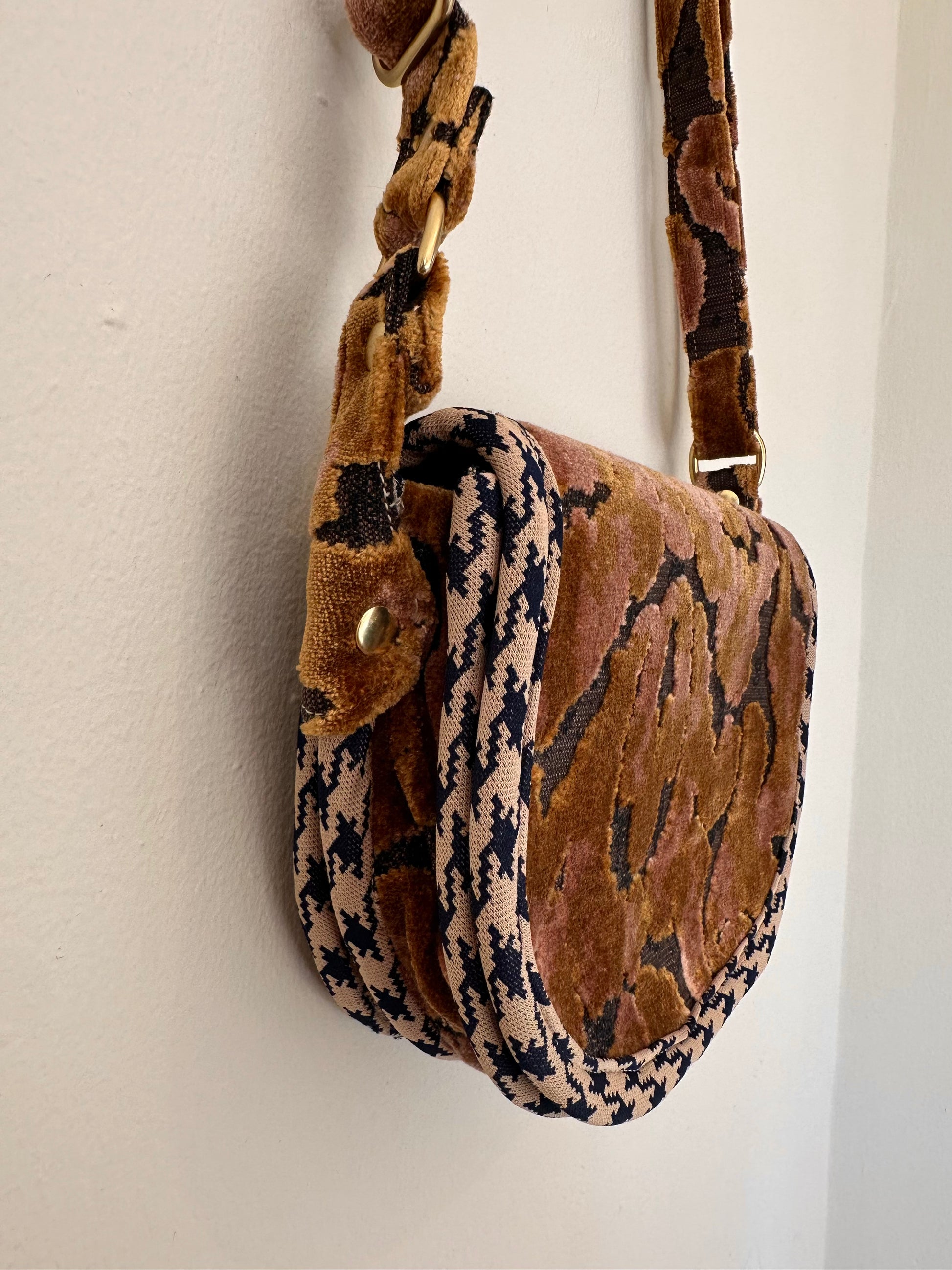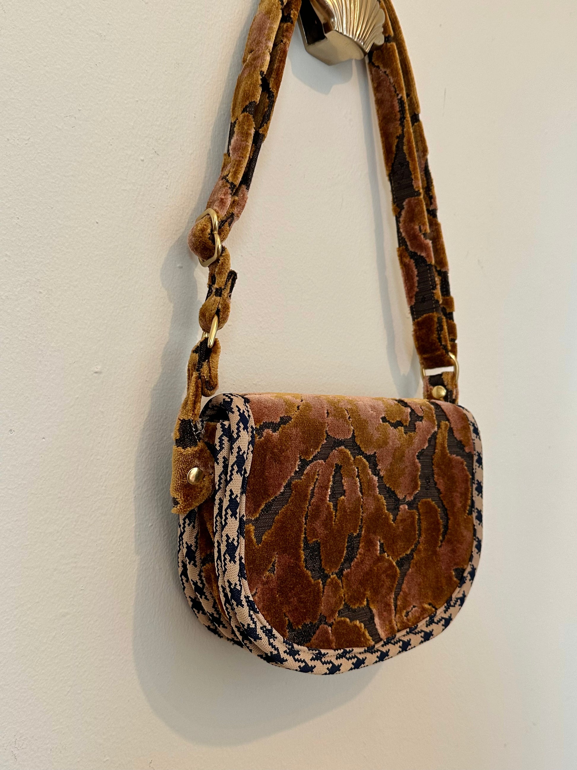 A compact silhouette yet intricate in design, she's half moon shaped with an accordion detailed base, finished with a flap closure secured by a magnetic clasp.
