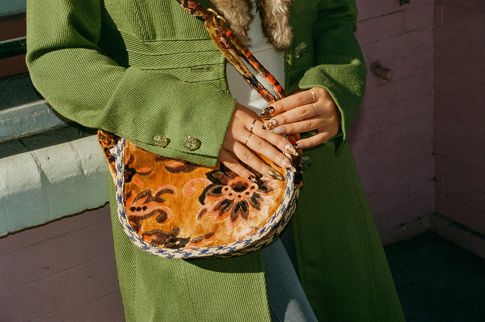 A compact silhouette yet intricate in design, she's half moon shaped with an accordion detailed base, finished with a flap closure secured by a magnetic clasp.